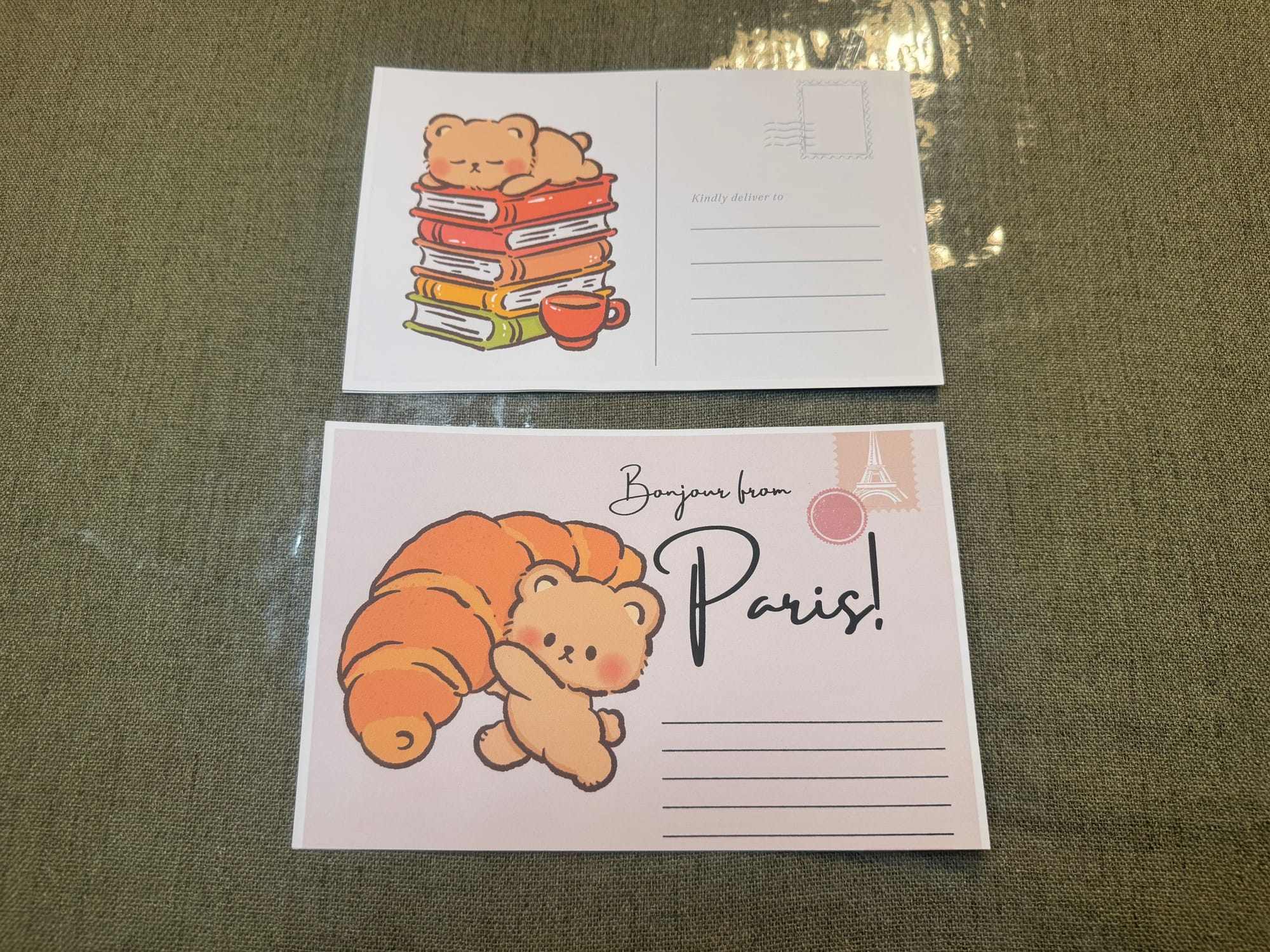 But I also had more ideas to use these cute illustrations. I decided to make greeting cards with envelopes to give to my family members during their birthday or special occasion. I will quickly write a message and include a gift card in their envelope with the card. Then my sister came up with the idea of post cards so then came these postcards shown below.